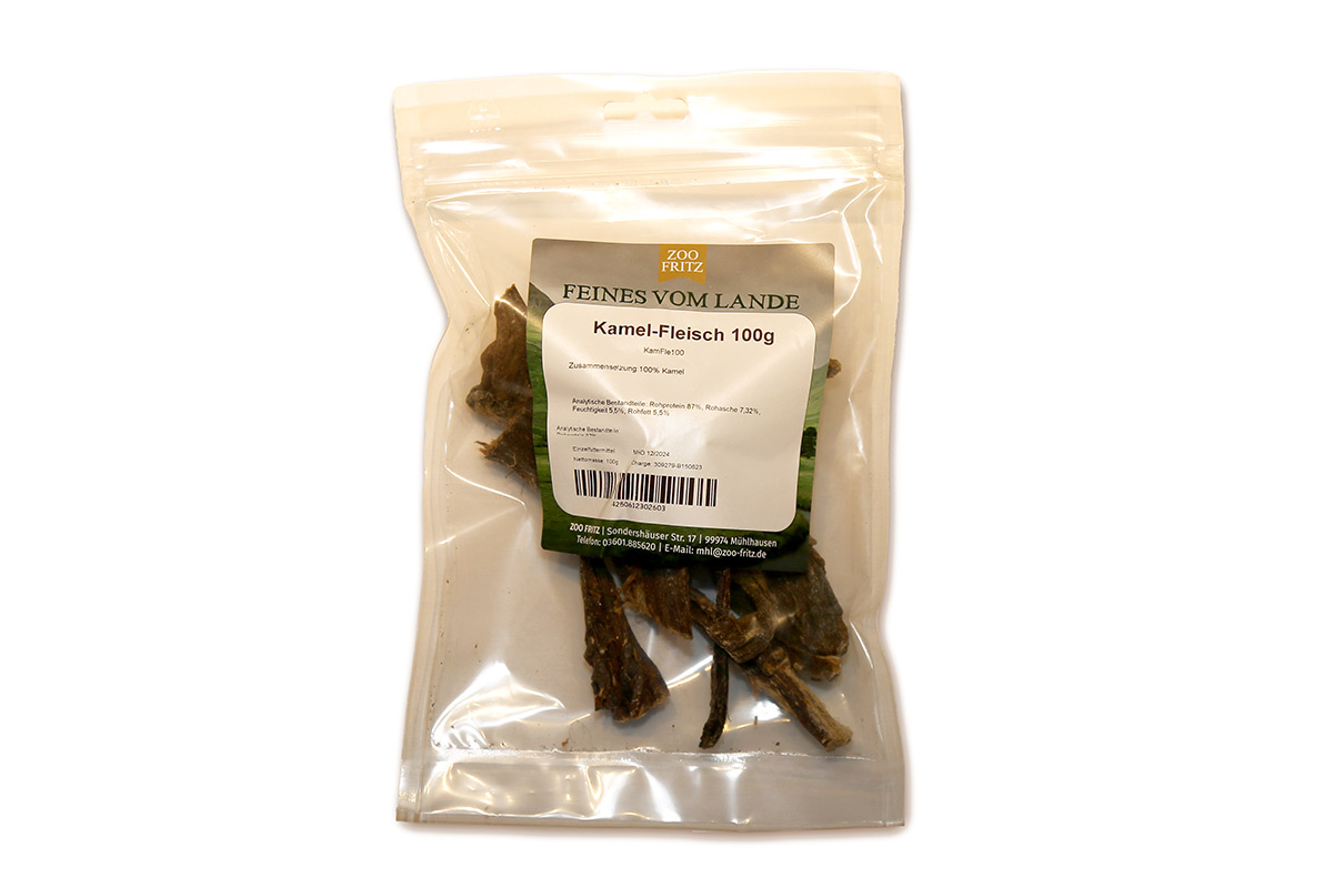 Unser getrocknetes Kamel-Fleisch für Hunde verfügt über einen besonders hohen Proteingehalt. Aufgrund der Beschaffenheit ist es zwar eher ein kurzer, dafür aber ein reichhaltiger Kausnack.